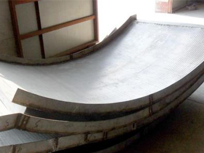 弧形篩板是由楔形無磁不銹鋼絲與T形不銹鋼絲通過自動電阻焊焊接而成的條縫篩板。篩板擋水板采用8毫米不銹鋼板制作。該篩板具有開孔率高、脫介、脫水效果好、使用壽命長等優點。